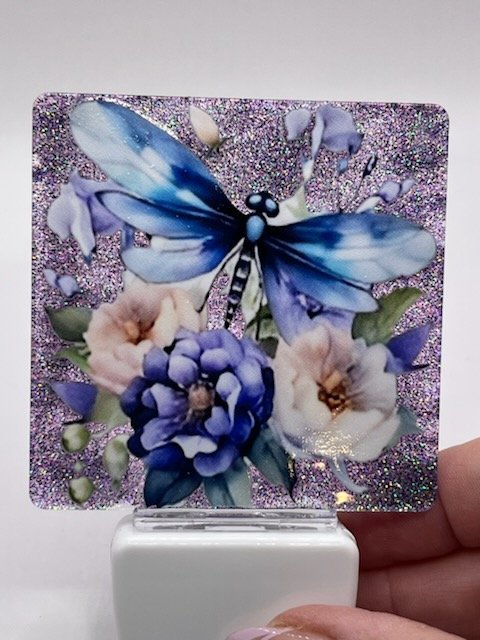 This luminous nightlight features a beautiful dragonfly and floral design on a glittering silver background. This light is perfect for adding elegance to any room. These shine a blue light and plug into any standard 110 amp outlet