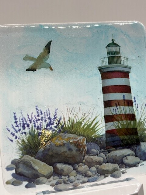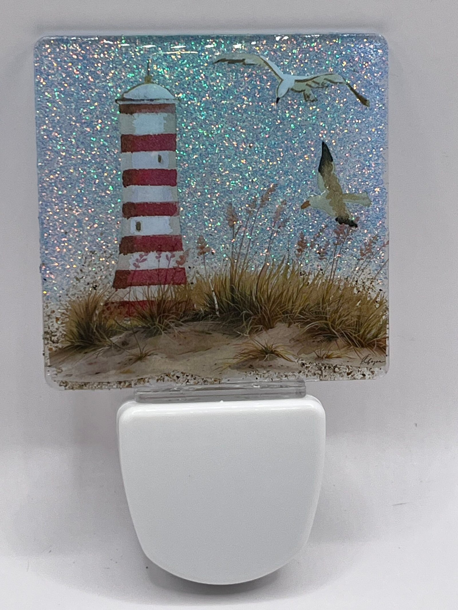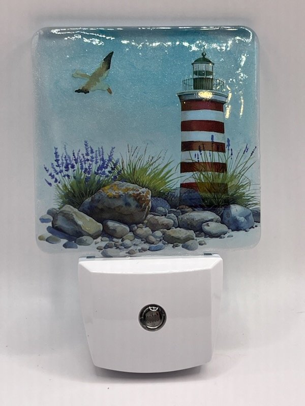 Light up your nights with this captivating nightlight! Featuring a vibrant red and white striped lighthouse scene on the beach with a playful seagull, it’s the perfect touch of coastal charm for any room. Pure seaside serenity! Shines a white or blue light and plugs into any standard outlet.
