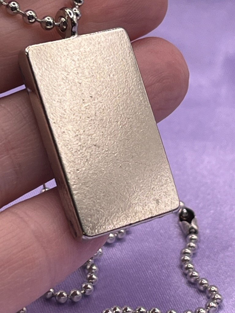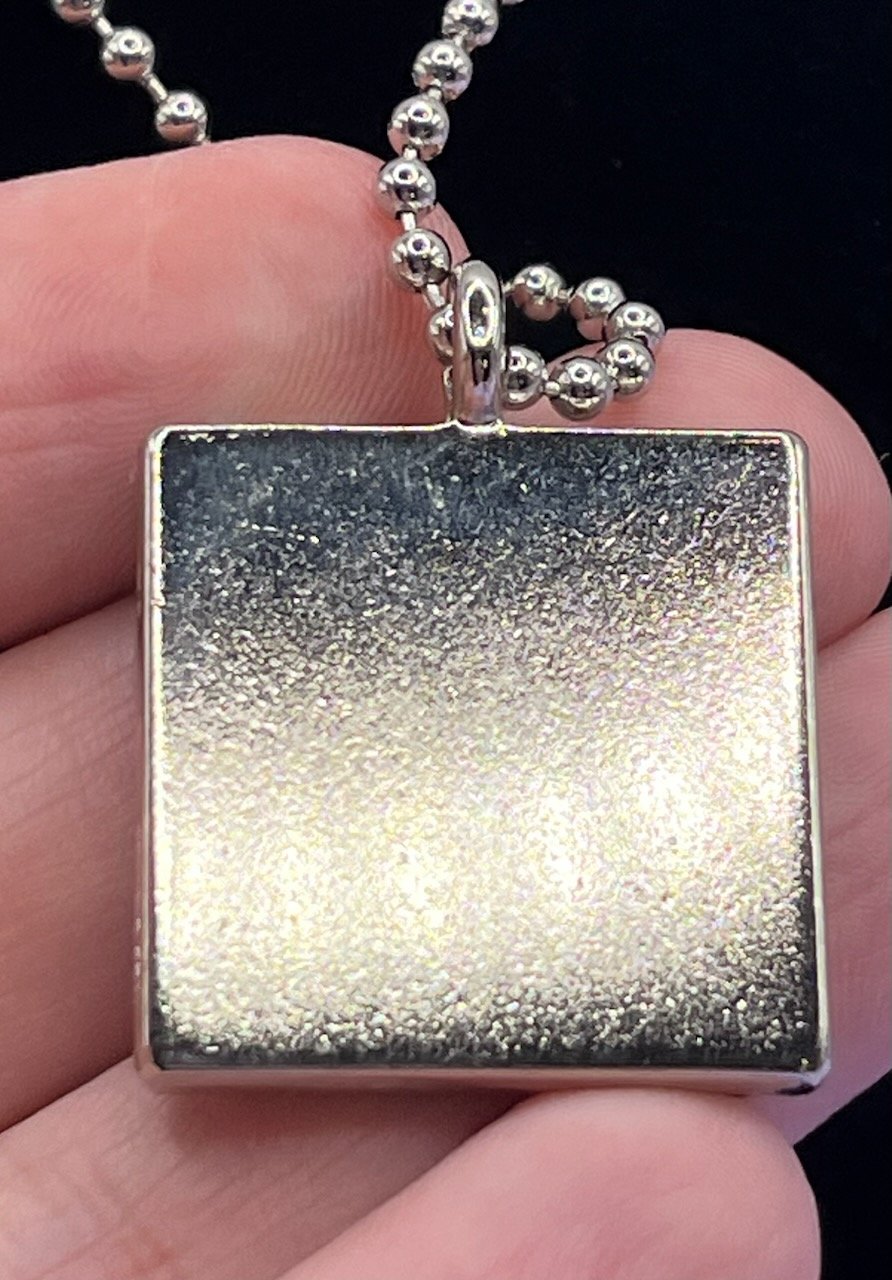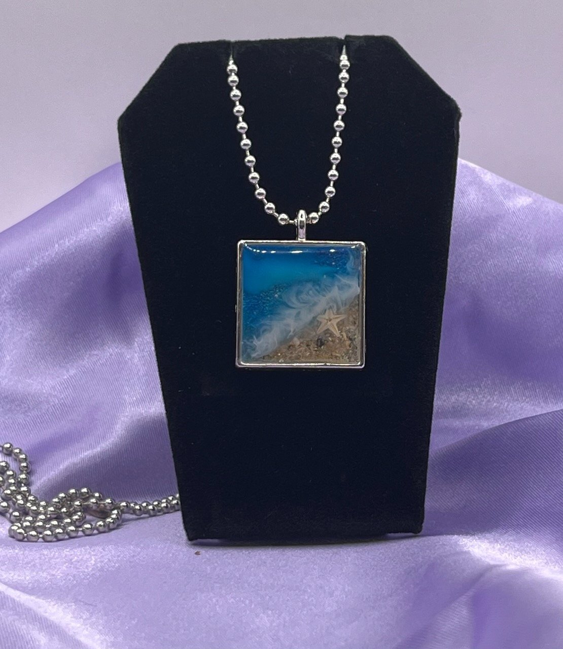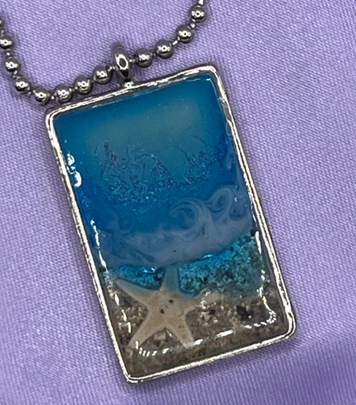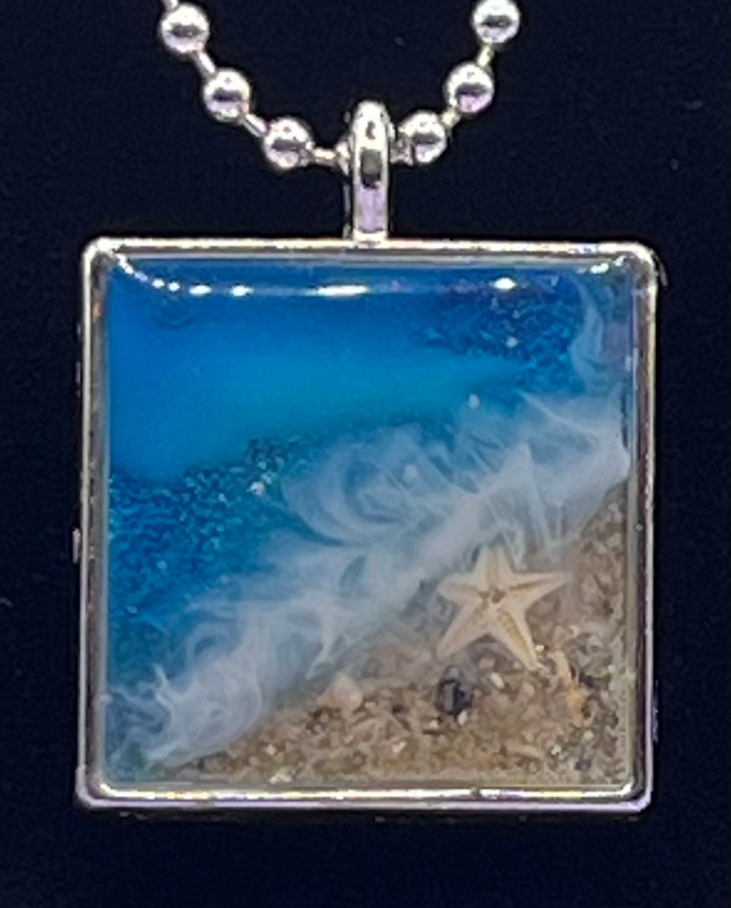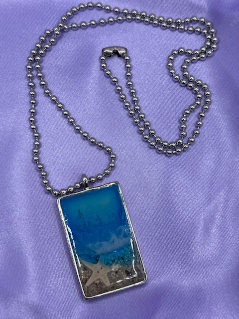 This beachy necklace captures a piece of beach paradise! A silverplated metal pendant is on an 18 inch silver ball chain and is filled with resin that holds a miniature ocean scene, complete with a tiny starfish and sparking sand.